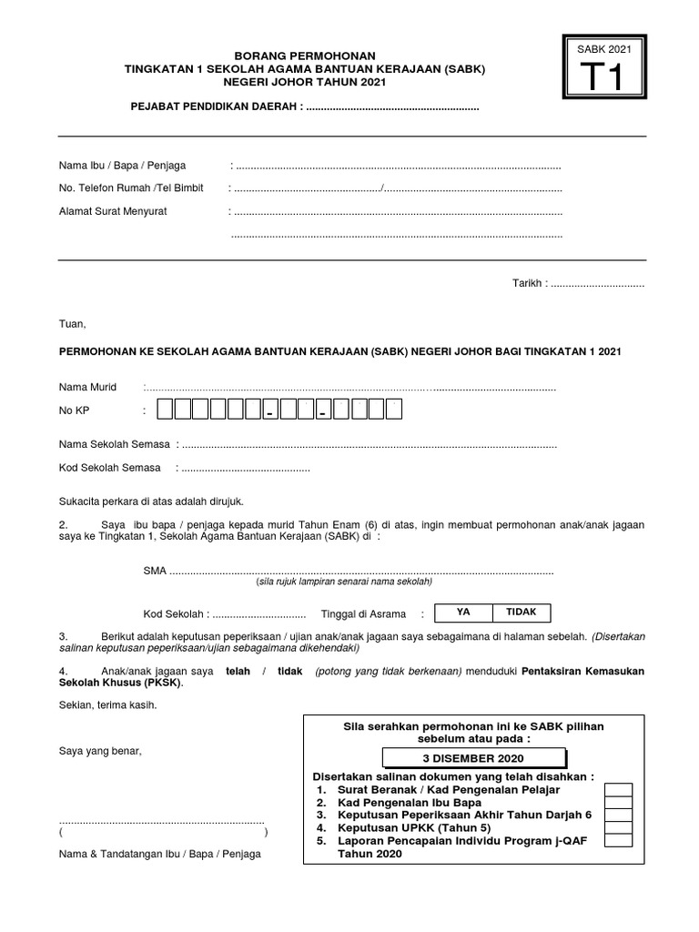 Borang Permohonan Sabk Tkt 1 2021 Pdf